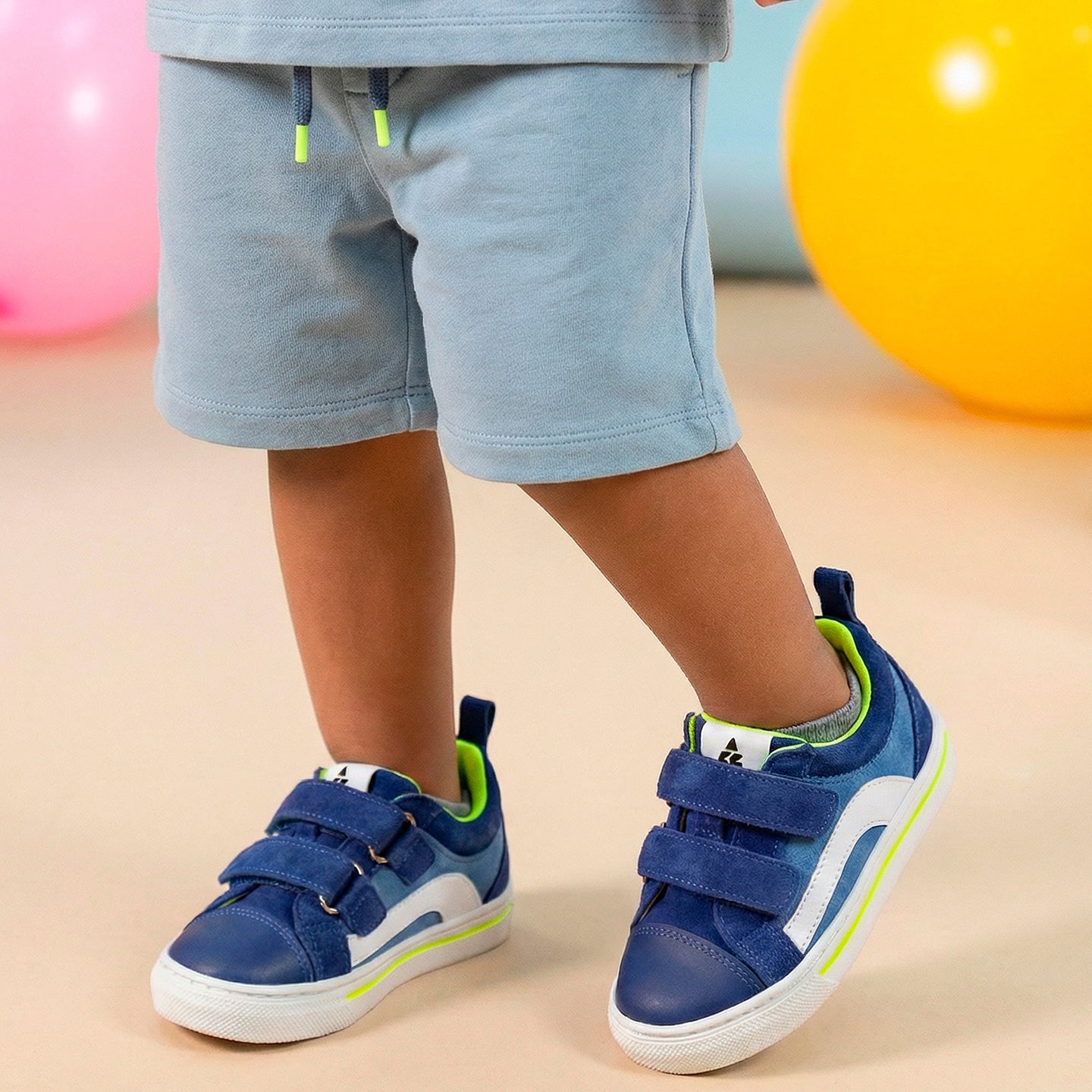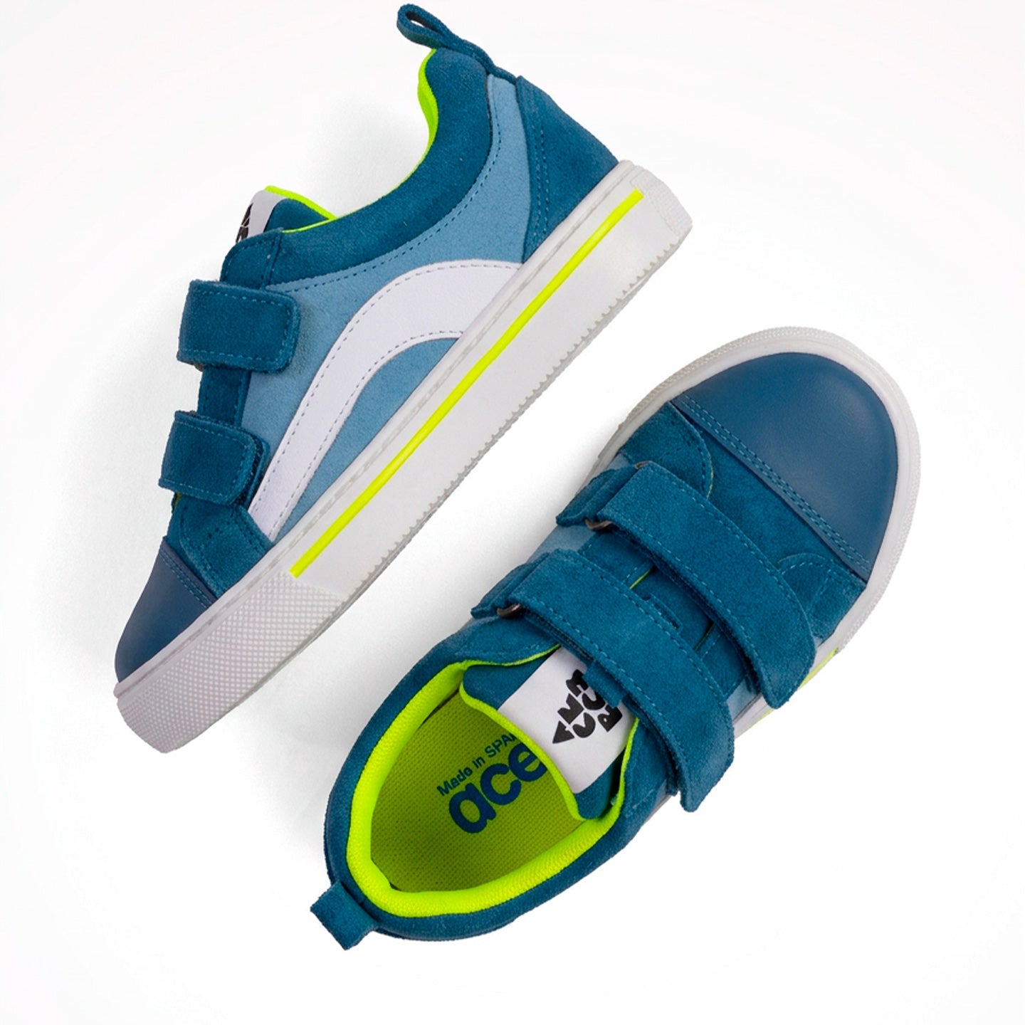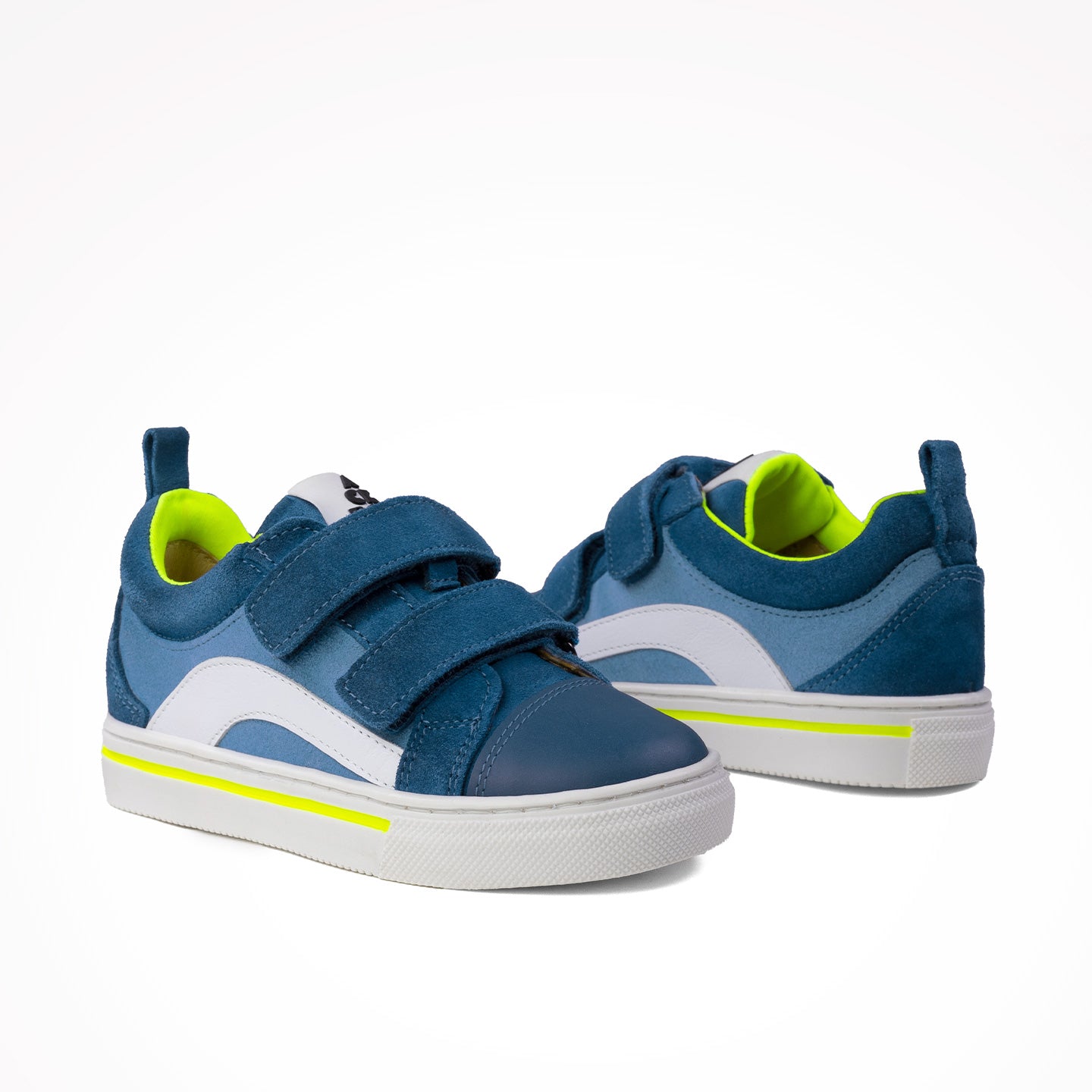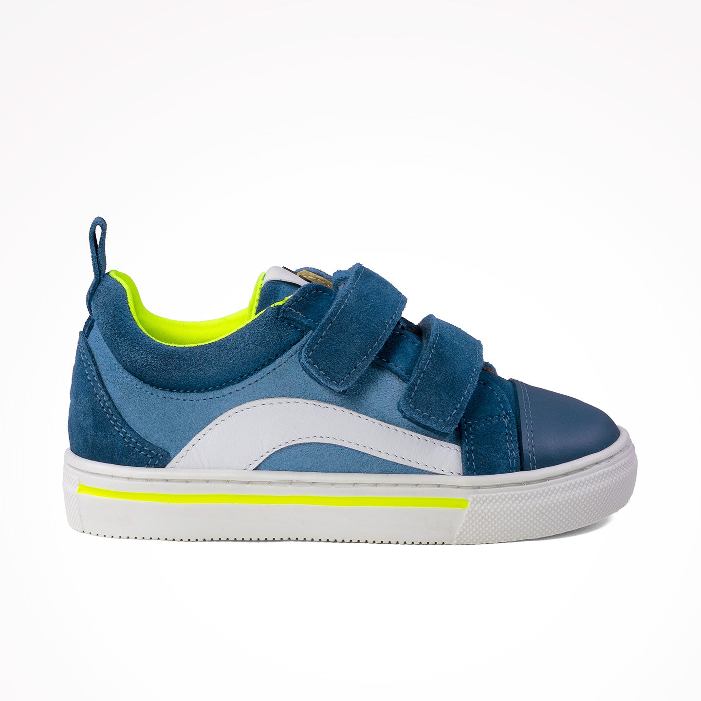 Brandan es una sneaker en denim azul con detalles en blanco y lima, cierre de doble velcro y suela caramelo flexible. La sneaker Brandan es de piel igual que el forro y plantilla.