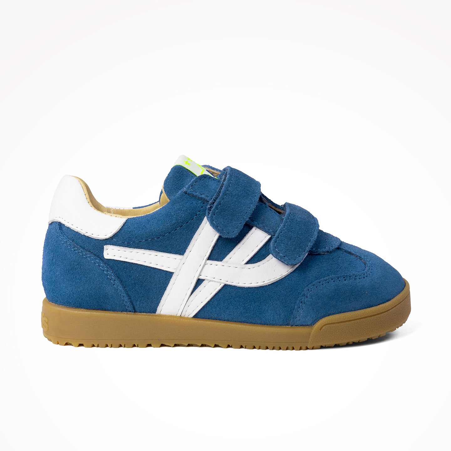 Cian es una deportiva en serraje azul denim con cierre de doble velcro y detalles blancos. Suela caramelo y diseño resistente perfecto para uso diario.  La sneaker Cian es de piel, y su forro y plantilla enteros de piel.