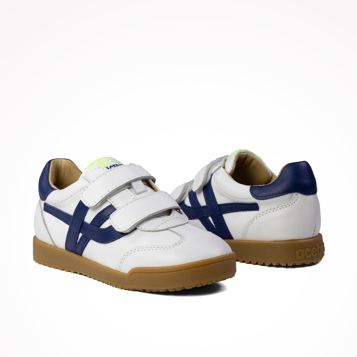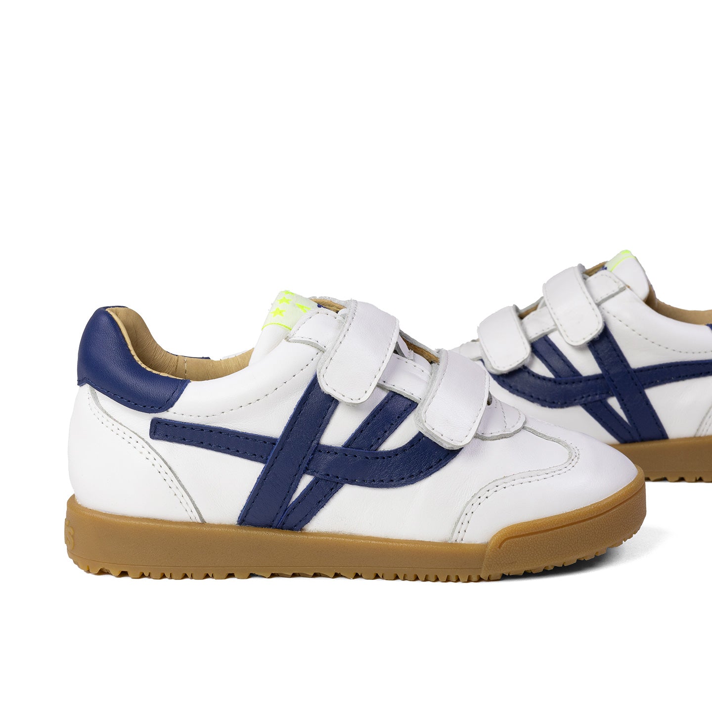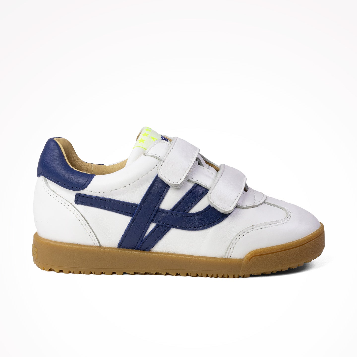 Dalmar es un sneaker en piel nappa blanca con cierre de doble velcro y detalles marino. Suela caramelo y diseño resistente perfecto para uso diario.  La sneaker Dalmar es de piel, y su forro y plantilla enteros de piel.
